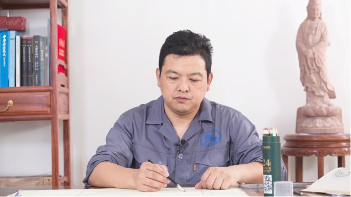 除了將石雕技藝學(xué)習(xí)好,傳承石雕非遺文化的重任也落在了尹國安的肩上,為此他招收了一批又一批同樣對石雕感興趣的人。周會文是尹國安的大徒弟,每次談到他的師父,他都有止不住的話要說。周會文說他們一開始什么都不會,篆刻、繪畫、設(shè)計等等都是一竅不通,都是尹國安手把手把他們給帶出來的。在教授技藝時,尹國安總是疾言厲色,只要發(fā)現(xiàn)徒弟出錯,一定會當(dāng)場指出來并嚴(yán)厲的批評,以一個嚴(yán)厲師者的形象來對待他們。